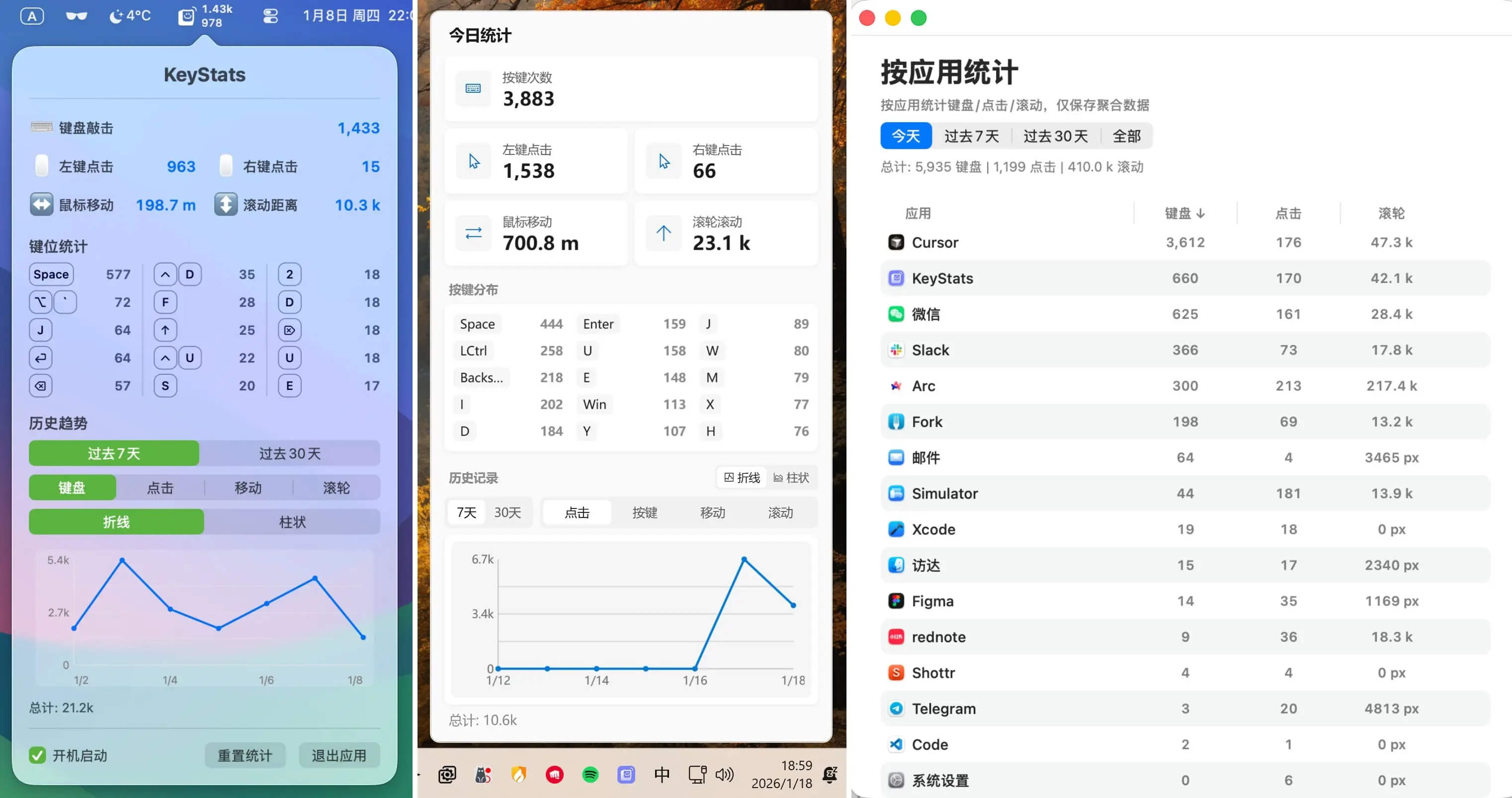 这是一款轻量级的 macOS/Windows 应用,在不记录具体输入内容的前提下,量化用户的输入行为,支持统计键盘敲击次数、鼠标点击次数、鼠标移动和滚动距离。